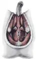 Зовнішній м'яз-замикач анального отвору (sphincter ani externus), розташований в ділянці тазової діафрагми. Він починається від куприка, кільцеподібно охоплює пряму кишку і спереду з'єднується з іншими м'язами промежини та з її сухожилковим центром. Цей м'яз складається з колових волокон, які між собою перехрещуються. Серед них розрізняються підшкірні (поверхневі) і глибокі волокна. Фасція промежини (fascia реrinеі), покриває поверхневі м'язи промежини зовні. Вона є частиною загальної поверхневої фасції тіла і помітна погано. Сідничо-відхідникова ямка (fossa ischioanalis), розташована в ділянці промежини по боках від м'яза-підіймача (levatoris ani) і відхідника. Вона має конічну форму, вгорі звужена. Латеральною її стінкою є внутрішній затульний м'яз, який покритий затульною фасцією, і внутрішня поверхня сідничого горба. Медіально ямка обмежена м'язом-підіймачем відхідника з нижньою фасцією діафрагми таза. Її передню стінку утворюють поперечні м'язи промежини, а задню — куприковий м'яз. Сідничо-відхідникова ямка заповнена жировою тканиною, яка формує жирове тіло (corpus adiposum fossae ischioanalis), судинами і нервами. Жирове тіло знизу покрите поверхневою фасцією промежини.