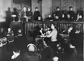 ![]() Д. М. Пронічева виступає в київському суді свідком у процесі над п'ятнадцятьма співробітниками німецької поліції (24.1.1946) | |