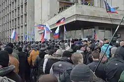 3 березня проросійськими демонстрантами було захоплено частину будівлі Донецької ОДА, де на засіданні депутати обрали нового голову ради Андрія Шишацького та підтримали рішення щодо проведення референдуму на території Донецької області стосовно найбільш гострих для мешканців області питань, засудивши заклики до відокремлення регіону від України[18]. Близько 1000 осіб[19] із російськими триколорами на чолі з самопроголошеним губернатором Павлом Губарєвим увірвалися до сесійної зали обласної ради, через що у залі сталася сутичка, під час якої демонстранти намагалися завадити виступу кандидату на посаду голови облради Андрієві Шишацькому[20]. Павло Губарєв виступив перед присутніми: у своєму виступі він назвав себе «народним» губернатором та наказав повідомити представникам російських ЗМІ, що облдержадміністрація в його особі не визнає центральної влади у Києві[21]. Крім того, самопроголошений губернатор заявив, що планується утворення «тимчасового уряду Донбасу», створення сил самооборони, а керівництву УВС, прокуратури та СБУ області було запропоновано скласти присягу «народній владі»[22].