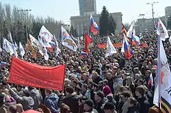 8 березня в Маріуполі пройшов п'ятитисячний мітинг, організований комуністичною партією України і представниками антифашистського комітету з вимогою проведення референдуму про федералізацію України, визнання права жителів Донецької області на самовизначення та вибір між вступом в митний або європейський союз.[65][66][67]