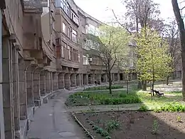 Крайні будівлі цього ряду при будівництві були облицьовані вірменським туфом. Центральні ж будинки були обштукатурені і пофарбовані в білий колір — для контрасту. Після Другої світової війни, при відновленні, вони придбали пишніші і витонченіші фасади з новими художніми елементами. Такі зміни, яким піддалися більшість будівель зруйнованого під час бойових дій Соцміста, символізували перемогу над фашизмом.