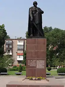 Монумент створений в 1955 році. Розташований в парку, біля Палацу культури ВАТ «Південний ГЗК». У братській могилі поховані 10 радянських воїнів, які загинули у боях за визволення міста Кривого Рогу 18 лютого 1944 року. Над могилою встановлена скульптура воїна, що захищає жінку[4].