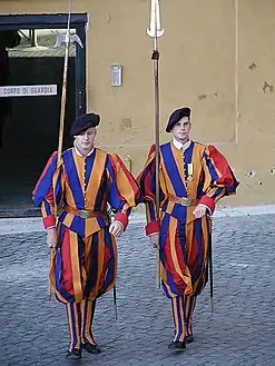 Швейцарські гвардійці з протазаном (праворуч) і алебардою (ліворуч)