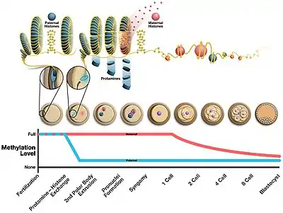 У разі запліднення, вміст голівки сперматозоїда потрапляє до яйцеклітини. Там ДНК від батька — батьківський пронуклеус, — зазнає протамін-гістонову заміну, коли гістони знову стають основними білками хроматину.[3]