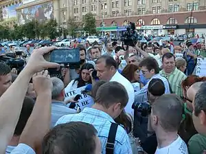 | 26 липня відбувся мітинг на центральній площі Первомайська проти свавілля міліції з вимогою створення слідчої комісії щодо зловживань працівниками Первомайського міськрайвідділу, її повного розформування, звільнення Людмили Нікітіної, а також звільнення Голови Мокодаївської ОДА Миколи Круглова. Після цього мітингувальники рушили до Первомайського МРВВС, де резолюцію передали начальнику місцевого відділку міліції[52][53][54]. Також перед мітингом повідомлялося, що до Первомайська стягуються спецпідрозділи «Беркуту» із сусідніх областей[55]. | |