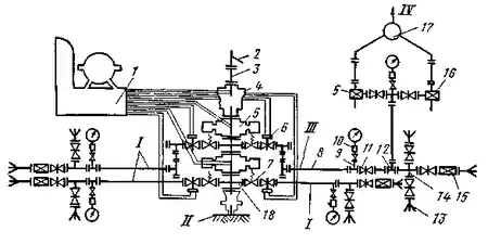 По струні 8 розчин проходить через відсікач, три засувки та по прямій лінії через швидкозмінний штуцер у комору. Гідравлічні опори, подолані на цьому шляху розчином, складаються з місцевих опорів на розширення потоку у фланцевих з'єднаннях і швидкозмінному штуцері, встановленому за засувкою 11. Задаючи певний діаметр насадки штуцера, можна добитися практично будь-якого перепаду тиску. Встановити певний перепад тиску можна за допомогою швидкозмінного штуцера.