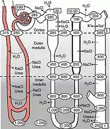 Вода реабсорбується шляхом пасивної дифузії, а от транспорт Na+ і Cl- АТФ-залежним активним транспортом, який регулюється АДГ. Антидіуретичний гормон діє у збиральних трубочках, де наявні Аквапорини (AQP2) та рецептори АДГ типу V2. При дефіциті води осмоляльніть плазми крові підвищується, а артеріальний тиск знижується, що стимулює виділення АДГ нейрогіпофізом. Наявність АДГ викликає утворення аквапоринів на люмінальній мембрані головних клітин збиральних трубочок, і відбувається екстракція води із сечі, що призводить до максимального антидіурезу (виведення невеликої кількості концентрованої сечі). У випадку надлишку води в організмі система працює навпаки: осмоляльність плазми знижується, АДГ не виділяється, аквапорини на мембрані збирних трубочок відсутні, що призводить до виведення значної кількості рідини нирками.Сечовина також відіграє важливу роль у концентруванні сечі. Білкова дієта призводить до збільшення утворення сечовини, що підвищує здатність нирок концентрувати сечу.[2]