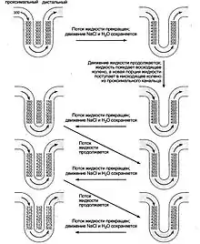 Провідну роль у роботі обмінника відіграє висхідне коліно петлі Генле, у якому реабсорбуються катіони та аніони (дифузією у тонкому сегменті та активним транспортом у товстому), проте лишається непроникним для води. у результаті інтерстиційна рідина стає гіперосмотичною по відношенню до вмісту низхідного коліна, а осмоляльність сечі поступово знижується і в корковий відділ дистального канальця надходить гіпотонічна сеча (100-200 мосмоль/л), кількість якої значно знижена, через всмоктування солей та води у петлі. Осмотичний тиск в оточуючих тканинах зростає у висхідному напрямку. Таким чином, підвищуючи концентрацію солей у міжклітинному просторі, висхідне коліно петлі створює умови для пасивної реабсорбції води у низхідному коліні[1]