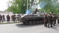 Близько 13 години з боку Агробази до міста в'їхало 14 танків Збройних Сил України, однак пізніше 6 з них покинули місто[80], містяни також повідомляли про входження вранці до міста з боку аеропорту військової техніки, кількість якої невідома[81]. Повідомлялося про захоплення сепаратистами однієї машини БМП-2 (За іншими даними БРДМ[82]), на якій було встановлено прапор Донецької народної республіки[83]. Після захоплення машини сепаратистами вона випадково вистрілила, пошкодивши стіну житлового будинку; внаслідок пострілу ніхто не постраждав[84]. 10 травня сепаратисти спалили машину біля приміщення міськради[82].