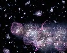 Зіткнення протогалактик у молодому Всесвіті (через мільярд років після Великого вибуху). Зображення НАСА