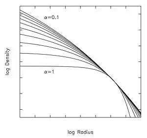 Чим більше значення , тим різкіше змінюється нахил із радіусом (див.малюнок). Закон Ейнасто можна описати як узагальнення ступеневого закону, , який має постійний нахил на логарифм-логарифмічному графіку.