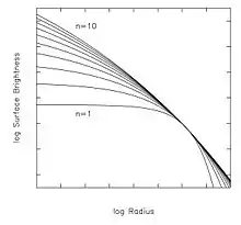 де — інтенсивність випромінення при . Параметр називають «індексом Серсіка». Він визначає ступінь кривизни профілю (див. малюнок). Чим менше значення , тим менша концентрація яскравості до центру і менший (крутіший) логарифмічний нахил при малих (великих) радіусах: