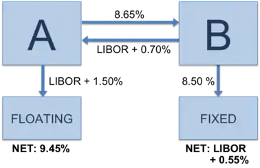 Малюнок: А отримує фіксований дохід 8,65 %, а платить LIBOR + 1.50 %. А хоче обидва потоку привести до виду LIBOR +. А укладає своп з В — «перенаправляє йому дохід 8,65 %» (у реальності не весь, а тільки сальдо «неттинг» — різницю між 8,65 % і LIBOR + 0,70 %) і «отримує дохід LIBOR + 0.70 %». Так як дохід з активу на малюнку не відображений в явному вигляді, це може вводити в оману.