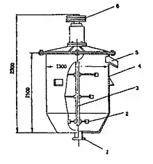 Другий варіант процесу «ОВЗУМС» було реалізовано на (ЦОФ) «Росія» виробничого об'єднання «Донецьквуглезбагачення» у 1984-86 pp. Під час дослідно-промислової апробації процесу «ОВЗУМС» переробці піддавався високозольний шлам енергетичного вугілля крупністю 0-6 мм . Установка складалася з трьох апаратів масляної сепарації (рис. 2), що являли собою циліндроконічні ємності висотою 1,5 м, діаметром 1,3 м і об'ємом 2,3 м3 кожна. Всередині бак обладнано консольним валом, закріпленим у обоймі з підшипниками. Обойма кріпилася до кришки баку. На валу розташовувалися три імпелери турбінного типу. Вал обертався від приводу з асинхронними електродвигунами потужністю 55 кВт. Середня швидкість обертання турбін імпелерів 20 м/с. Апарати масляної селекції були встановлені послідовно з невеликим перепадом висот, що забезпечувало найкращі умови транспортування пульпи самопливом. Технологічний комплекс по збагаченню й обезводненню вугільних шламів ЦЗФ «Росія» з використанням процесу «ОВЗУМС» представлено на рис.3.