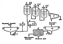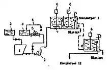 Шламові води фабрики поступають у радіальний згущувач 1, де протікає процес прояснення водної фази і згущення осаду без добавки флокулянту. Прояснена вода є оборотною. Осад насосу 2 направлявся на масляну селекцію. У вихідну пульпу вводились за допомогою насосів-дозаторів регулятор середовища (ємність 5) та зв'язуюче (ємність 6). Завантаження апаратів-агітаторів пульпою проводилося знизу. Крутильний момент на валу 3 передавався від індивідуальних енергоприводів 4 ремінною передачею. Продукт агломерації обезводнювався на центрифузі 7. Концентрат (кек) змішувався з відсівом, а відходи (фугат) подавалися в радіальний згущувач 8. Згущені відходи насосом 9 перекачувалися для остаточного обезводнення на блок фільтр-пресів 10. При цьому прояснення відходів (фугату) здійснювалося без застосування флокулянтів, так як вони мають достатню коагуляційну здатність. Обезводнені на фільтр-пресі відходи вивозилися у відвал.