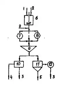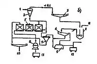 б) 1 — вихідна пульпа; 2 — зв'язуюча речовина (масляний агент); 3 — гранулят; 4 — фугат; 5 — підрешітний продукт; 6 — турботрон; 7 — грохот; 8 — фільтрувальна центрифуга; 9 — вугілля крупністю більше 0,1 мм: збагачений іншими методами