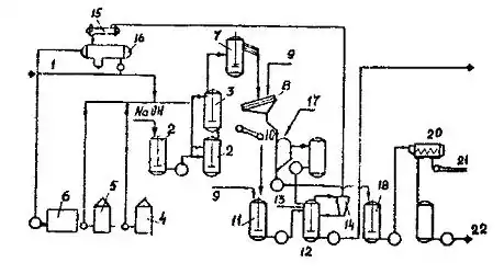 Технологічна схема дільниці СМА (рис.1) передбачає попередню обробку суспензії вугільних шламів водним розчином NaOH (регулятора середовища) в спеціальному змішувачi 2. Далі суспензія з концентрацією за масою 30 % подається в два послідовно встановлених міксери 3, призначених для обробки матеріалу зв'язуючою вуглеводневою речовиною. Застосовують композиційне зв'язуюче з пентану, оксі-сполук і мазуту. Власне агломерація проводиться в апараті 7, обладнаному вертикальною багатоярусною мішалкою. Продукт агломерації розділяється на концентрат та відходи на грохотi 8 з подачею води для відмиву з поверхні гранул мінеральних фракцій. Агломерат (гранулят) конвейером 10 направляється в бак 11 збагаченого вугілля, де розріджується технічною водою і подається на операцію знемаслення в спеціальний пристрій 12. Знемаслений концентрат подрібнюють в млинах дільниці приготування ВВВС. Відходи агломерації після вилучення з них пентану на сепараторi 17 направляють в ємність 18 і далі — на зневоднення до центрифуги 20.