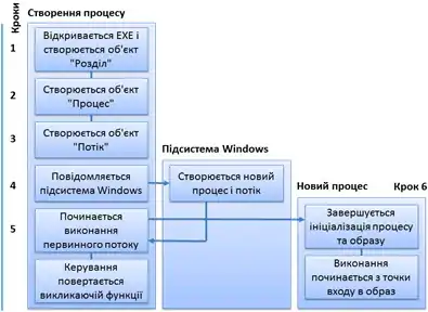 - Підсистема Windows повідомляється про створення нового процесу й потоку.