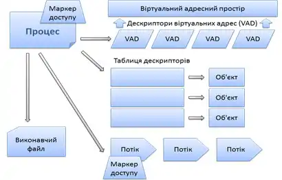 - список відкритих дескрипторів (handles) різних системних ресурсів –комунікаційних портів, файлів та інших об'єктів, доступних усім потокам даного процесу;