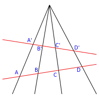 Перспективне відображення бієктивне, зберігає точку перетину прямих і зберігає подвійне відношення четвірки точок.