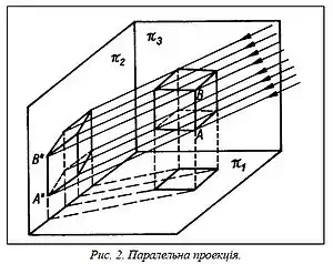 В основі побудови всіх зображень лежить спосіб проєціювання, відповідно до якого всі проєкції розділяються на перспективні (центральні) і паралельні (рис. 1, 2). У кожній з них формування зображення здійснюється прямолінійними проєктувальними променями, які проходять через всі точки зображуваної фігури до перетину з площиною проєкції. У перспективних проєкціях промені виходять з однієї точки (центра проєкції), а в паралельних вони паралельні заданому напряму. У окремому випадку проєктувальні промені можуть бути перпендикулярними площині проєкції, тоді проєкція називається ортогональною.