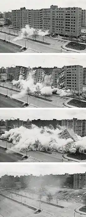 Після кількох місяців підготовки, перший будинок було знесено детонацією вибухової о 15 годині, 16 березня 1972 року.[15] Другий був знесений 22 квітня 1972 року.[15] Після декількох знесень 15 липня, перший етап знесення був завершений. В процесі того як уряд відхиляв плани реабілітації, решта будинків Прюїтт-Айгоу були знесені протягом наступних трьох років, і ділянка була остаточно очищена в 1976 році зі знесенням останнього будинку.