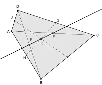 Відрізки GH та IJ, які з'єднують середини протилежних сторін (бімедіани) опуклого чотирикутника, перетинаються в точці, що лежить на прямій Ньютона. Ця точка K ділить навпіл відрізок EF, який з'єднує середні точки діагоналей[1].