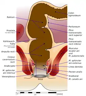 Нижня, вузька частина прямої кишки, що проходить через промежину, і що розташована дистальніше, ближче до анального отвору, називається заднепрохідним каналом (лат. canalis analis), верхня, ширша, така, що проходить в області крижів — ампулярною частиною прямої кишки, або просто ампулою прямої кишки (лат. ampulla recti).