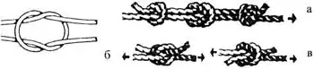 Рис. 1. Прямий вузол: а — прямий вузол з контрольними вузлами, б, в — неправильно зв'язаний вузол
