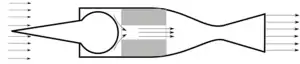 - повітря, яке поступає зі швидкістю польоту у вхідний пристрій двигуна, гальмується (на практиці, до швидкостей 30—60 м/сек, що відповідає числу Маха 0,1 — 0,2), його кінетична енергія перетворюється уа внутрішню енергію — його температура та тиск підвищуються.