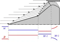 Гальмування надзвукового газового потоку відбувається завжди розривно (стрибкоподібно) — з утворенням ударної хвилі, яка називається також стрибком ущільнення. Процес стиснення газу на фронті ударної хвилі не є ізоентропійним, внаслідок чого у ньому мають місце незворотні втрати механічної енергії, та ступінь підвищення тиску в ньому менша, ніж у ідеальному — ізоентропійному процесі. Чим інтенсивніший стрибок ущільнення, тобто чим більша зміна швидкості потоку на його фронті, — тим більші втрати тиску, які можуть перевищувати 50 %.