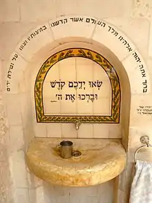 ![]() Другий вірш псалому 133, написаний над умивальником, який використовувався для ритуалу миття рук, синагога «Beit El yeshiva», Старе місто, Єрусалим | ||||