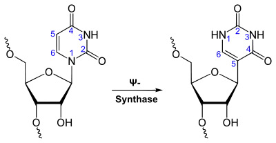 Додавання псевдоуридину до молекул РНК відбувається шляхом ізомеризації уридину — трансглікозилюванні, тобто переміщенні звя'язку з цукром, рибозою, від першого положення урацилу до п'ятого. Таким чином 1-рибозил урацил стає 5-рибозил-урацилом. Реакція відбувається за допомогою ферментів псевдоуридин-синтаз (англ. pseudouridine synthase, PUS). Така модифікація змінює C-N глікозидний зв'язок між рибозою та азотистою основою (див. рис. «псевдоуриднилювання РНК») на C-C зв'язок, який є більш міцним. Також додається ще один донор гідрогену, який збільшує стійкість ψ-А пари[2]. -