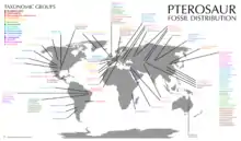 | Поширення викопних решток. Кольори відповідають таксономічним групам.[lower-alpha 1] | |