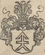 Клейнод: три пера страуса, з яких середнє червоне, між ними зелені пальмові гілки, все це між двома групами кавалерійських хрестів у єрусалимському стилі.