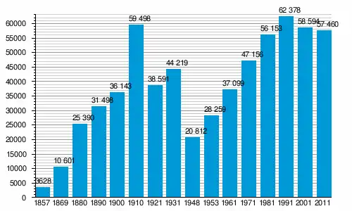 Населення міста за даними перепису 2011 року становило 57 460 осіб[14], 17 з яких назвали рідною українську мову[15].