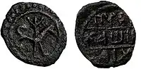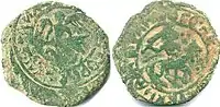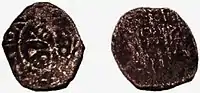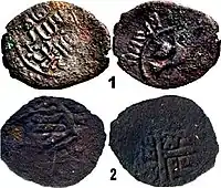 - 5 тип: На аверсі зображення хреста на підніжжі, на реверсі арабський надпис. Вага монети 1,45 гр.. Припускається, що виготовлено в Городці[29].