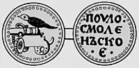 Деякі дослідники вважали, що одне з найстаріших зображень Смоленського герба карбувалося на мідному пулі князівства[31][32][33]. За їхніми припущеннями монета була датована 1387-1404 роками, із викарбованою на ній птахом на гарматі, малюнок якої вперше було зображено в 1777 році в одному з каталогів і зберігається у Геттінгенській бібліотеці. Згодом зображення цього пуло публікувалося в багатьох працях, навіть у 70-х роках ХІХ ст. «монета» з'явилася в приватних колекціях[34]. Врешті-решт у 1974 році досліднику Спаському Івану Георгійовичу вдалося знайти доказ того, що малюнок у бібліотеці університету ніщо інше, як помилкове зображення гарпії на московських пулах[35] і надпис «пуло смоленъское(рос.)» невірно трактований надпис «пуло московское(рос.)». Стосовано самих монет, то вони не були нічим іншим, як підробкою. Врешті про їхню фальсифікації підтвердили і аналізи металу «монети» з приватної колекції[34].
