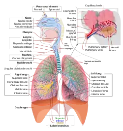 ![]() Схематичний вигляд дихальної системи людини з її частинами та функціями. Схематичний вигляд дихальної системи людини з її частинами та функціями. | |