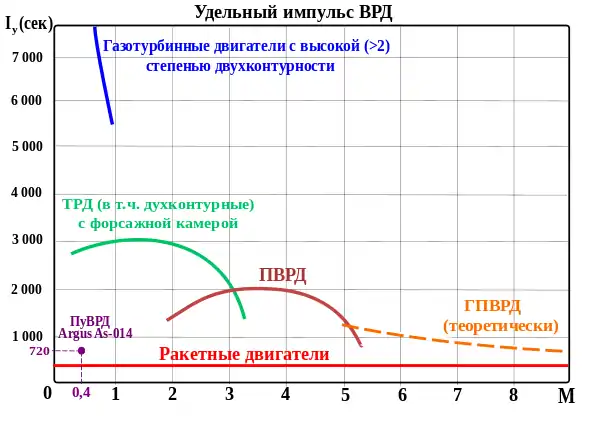 Ракетні двигуни окрім тяги характеризуються питомим імпульсом, який є показником ступеню досконалості або якості двигуна. Цей показник є також мірою економічності двигуна. У наведеній нижче діаграмі у графічній формі показані верхні значення цього показника для різних типів реактивних двигунів, в залежності від швидкості польоту, вираженої у формі числа Маха, що дозволяє бачити область застосування кожного типу двигуна.