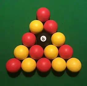 піраміда — щільно викладені одна до одної кулі у вигляді рівностороннього трикутника, які встановлюються на стіл перед початком гри;