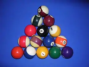 - шістнадцять невеликих нумерованих різнокольорових куль (d=57.2мм), які розділені на групи, перша з яких — біла з кольоровою смугою, друга — з повністю кольорових куль;
