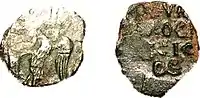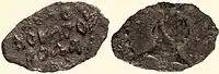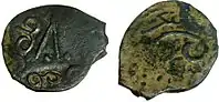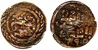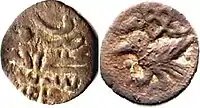- 4) Анепіграфна монета з зображенням звіра, риб, квітки, сонця та ін. на аверсі. На всіх монетах Булгару карбувалася двозубцева тамга Бату-хана. Карбувалися на початку XIV ст. і до 30-х років[10].