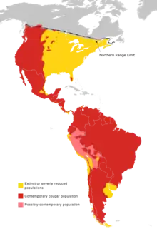 | Поширення пуми: жовтим — зникла, рожевим — ймовірна присутня, червоним — присутня | |