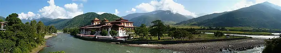 ![]() Пунакха-дзонг в оточенні квітучих дерев джакаранда в місті Пунакха | |