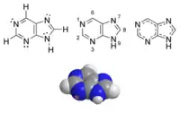 Приклади пуринів: аденін (2), гуанін (3), гіпоксантин (4), ксантин (5), теобромін (6), кофеїн (7), сечова кислота (8) та ізогуанідин (9)
