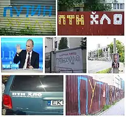 | Підпис зображення: | Верхній ряд: написи на парканах у Луганську та Броварах. Посередині: Володимир Путін, написи біля Посольства РФ у Києві та Посольства РФ у Канаді. Нижній ряд: напис на автомобілі та на паркані |