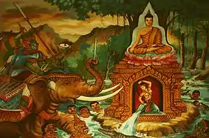 Згідно з легендою, що розповсюджена в Азії і описана у книзі «Pathamasambodhi», Будда медитував під деревом Ботхі, коли Мара (зле божество) спробував відволікти його від досягнення просвітлення. Мара з'явився разом з донькою і армією демонів. Будда потягнув руку вниз і торкнувся землі, викликаючи її бути свідком добрих справ і заслуг Будди. Земля з'явилася у вигляді красивої жінки, викрутивши з коси воду, вона влаштувала потоп, що змив армію Мари. Після чого Будда отримав просвітлення.