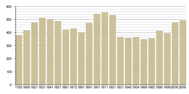 Динаміка населення (base Cassini de l'EHESS pour les nombres retenus jusque 1962[3], base Insee à partir de 1968 (population sans doubles comptes puis population municipale à partir de 2006)[4] · [5] ):
