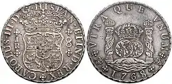 Прийнята в Європі назва іспанської та іспано-американської срібної монети песо (ісп. peso), що дорівнює восьмом реалам.